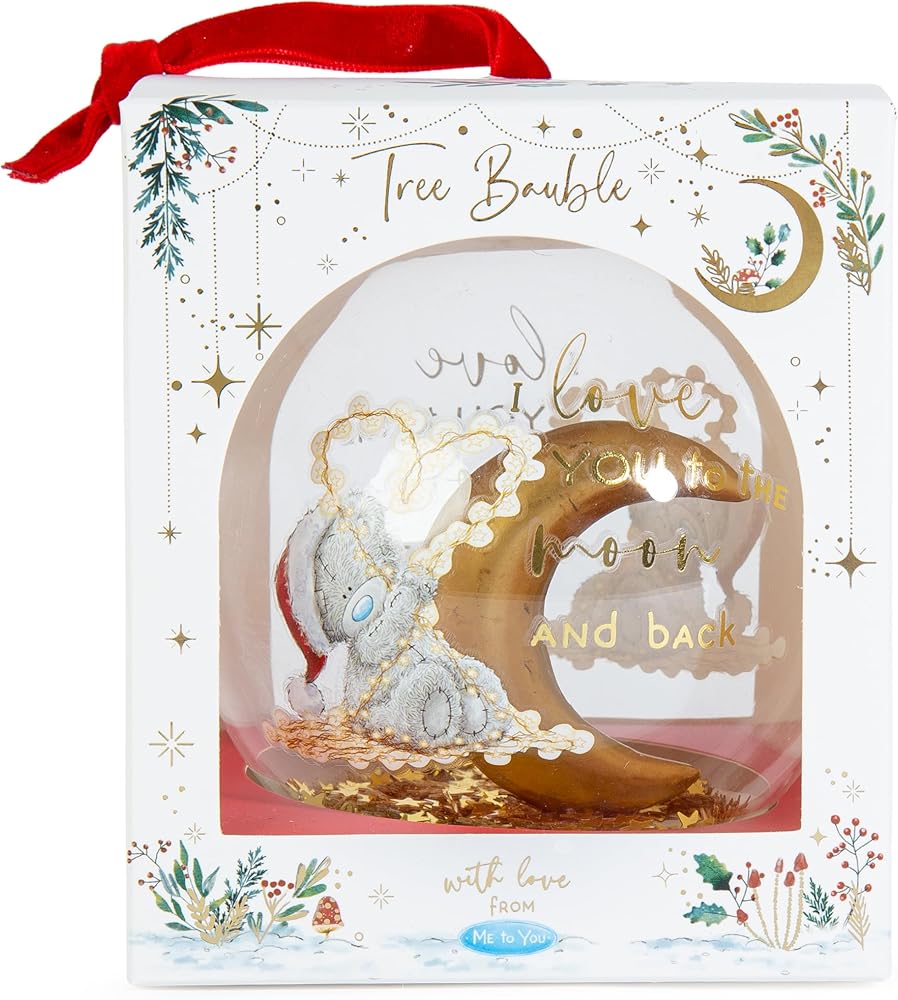 This eye-catching bauble will look wonderful on the Christmas tree with its luxury red hanging ribbon, adorable Tatty Teddy illustration and heartfelt caption to someone you love. It's a thoughtful little Christmas gift for girlfriend, boyfriend, fiancé, fiancée, husband, wife, partner, family member or anyone who means the world to you! The spherical glass bauble contains an image of Tatty Teddy in a Santa hat leaning against a crescent moon; gentle shake the glass to create a magical whirl of glittery gold stars. Printed in gold foil on the outside of the bauble are the words 'I love you to the moon and back'. Your loved one will be thrilled to receive this gorgeous bauble which comes presented in a luxury Signature Collection gift box. Crafted with love and care from premium materials, Me to You gifts add a touch of festive fun at this magical time of the year.