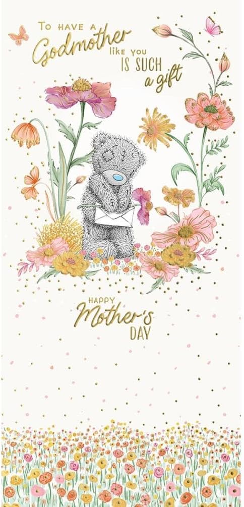 BEAUTIFUL MOTHER'S DAY CARD FOR YOUR GODMOTHER - surprise your wonderful godmother with this adorable card featuring a hand sketched illustration of Tatty Teddy in a magical flower meadow LUXURY GOLD FOIL FINISH - with gold lettering and a beautiful gold foil finish on the butterfly and flower motifs, this Me to You card is sure to add sparkle to a special day THOUGHTFUL WORDS - front cover message 'To have a godmother like you is such a gift…Happy Mother's Day' Inside message 'Have a truly wonderful day' CARD MEASURES 4 x 8 INCHES - made from highest quality materials, with love and care, this stunning card is sure to be cherished