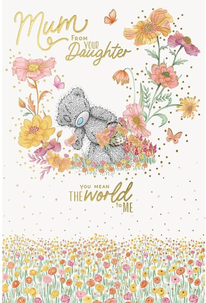 BESPOKE MOTHER'S DAY CARD FROM YOUR DAUGHTER - this lovely card features a cute illustration of Tatty Teddy in a magical flower meadow with butterflies flitting around LUXURY GOLD FOIL FINISH - with gold lettering and a beautiful gold foil finish on the butterfly and flower motifs, this card is sure to add sparkle to her special day THOUGHTFUL WORDS - front cover message 'Mum from your daughter…you mean the world to me' Inside message 'Happy Mother's Day with lots of love' CARD MEASURES 6 x 9 INCHES - made from highest quality materials, with love and care, this stunning card is sure to be cherished