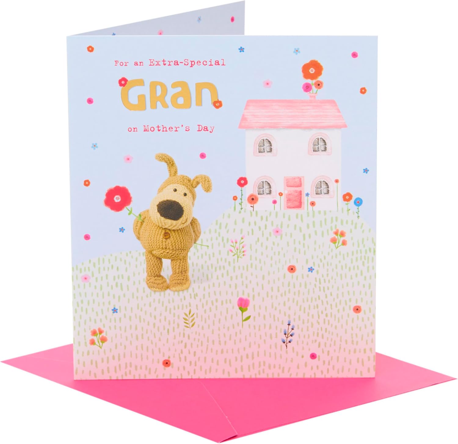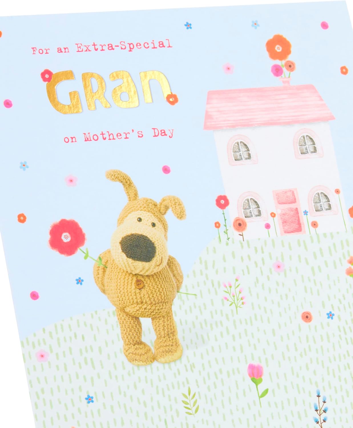 Boofle Stood Holding A Flower Next To A House Gran Mother's Day Card