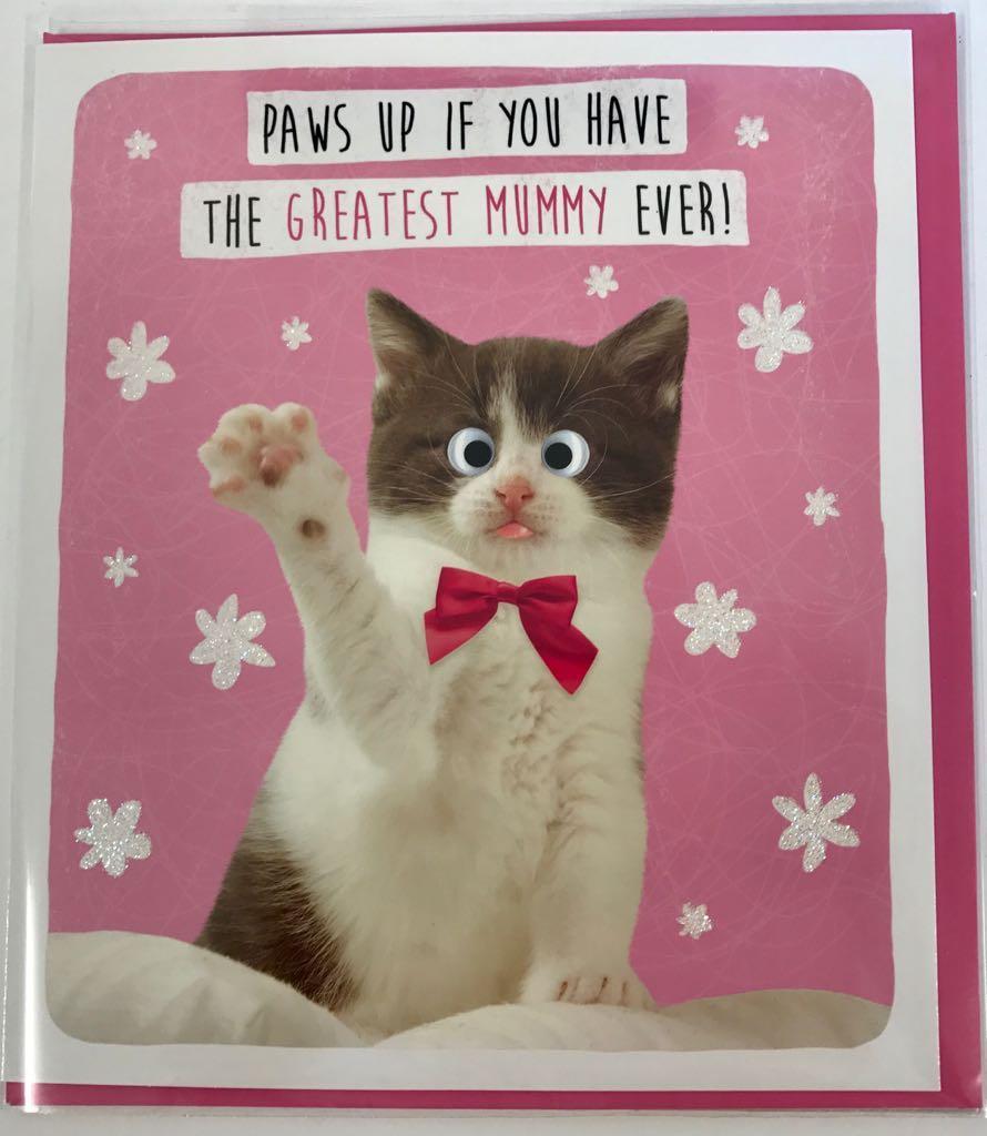 Greatest Mummy Ever Adorable Cat Paws Up Mother's Day Funny Card. Send this Mother's Day Card to your Mummy and make her smile. The little cat jumps excitedly as she says how glad she is to have her Mummy. Includes a cream envelope. Verse Inside - Happy Mother's Day! Size 159 x 184 mm.