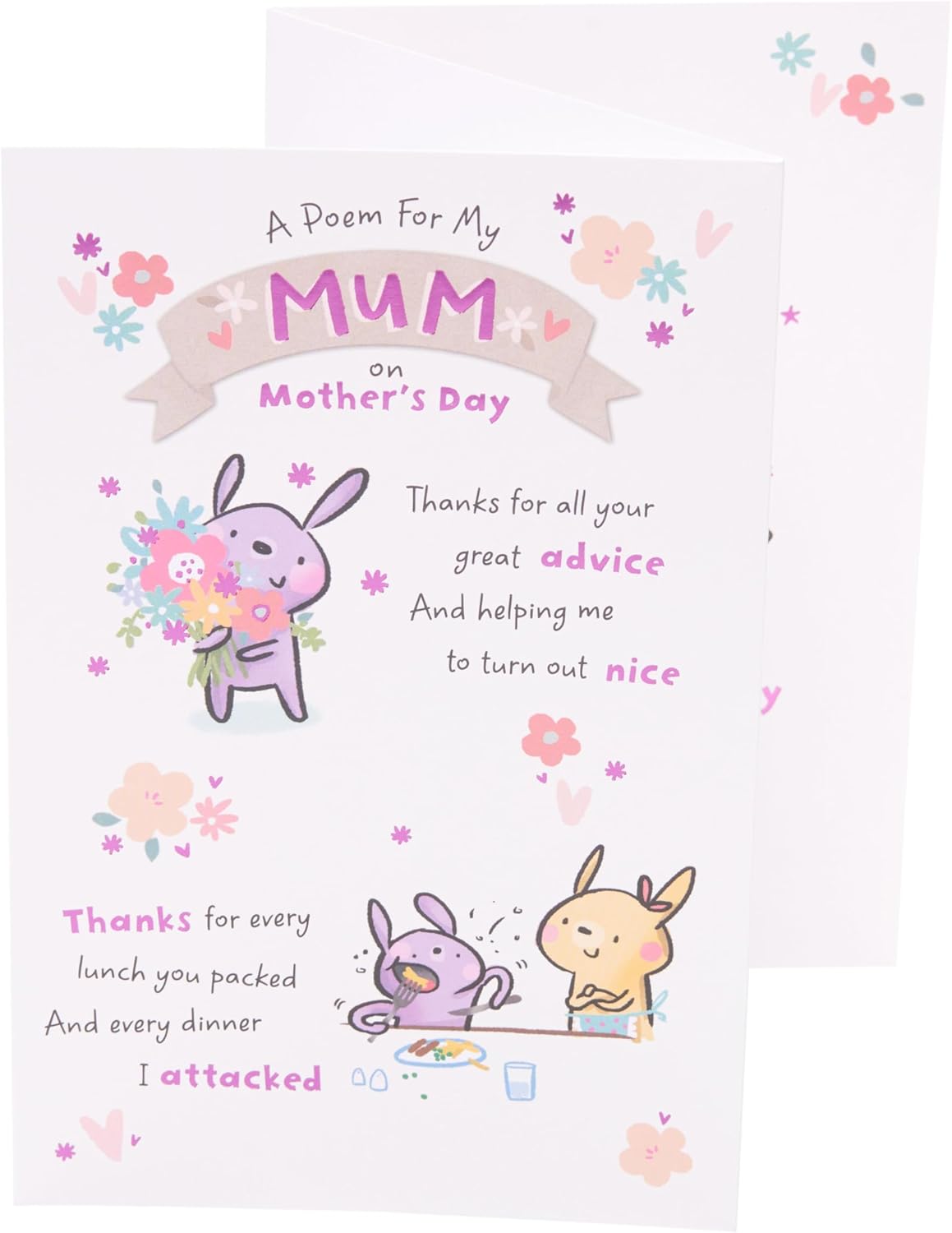 A fun and sweet Mother’s Day card for Mum, featuring cute rabbit illustrations and a long descriptive verse, thanking her for all the things she has done for you over the years. Message Inside Reads: - As mothers go, You're Number One! Happy Mother's Day Card Size: 149mm x 229mm | Envelope Included