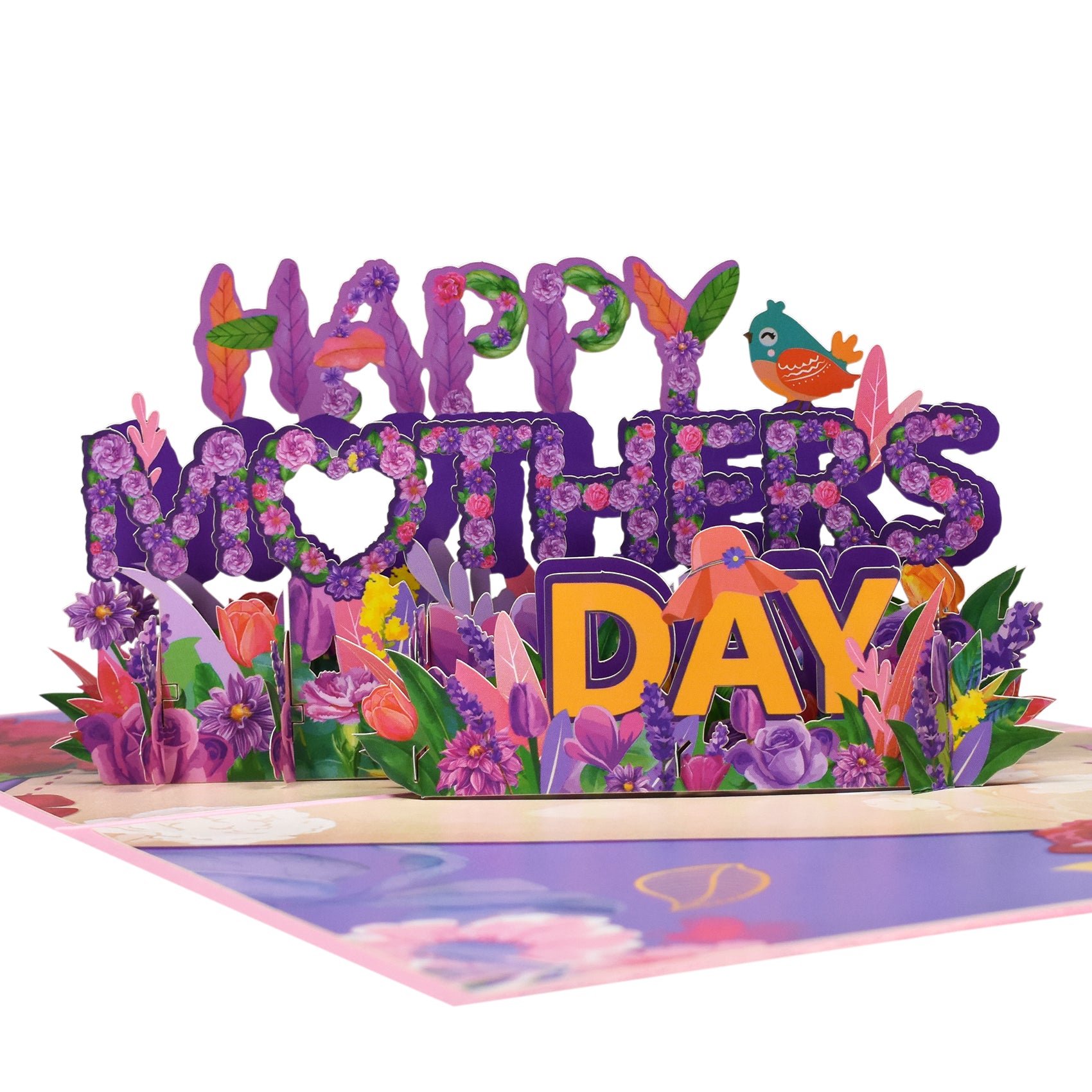 This cheerful 3D pop-up Mother’s Day card opens to reveal bold “HAPPY MOTHERS DAY” letters surrounded by layered floral decorations including tulips, lavender, and mixed blossoms with a small songbird accent. The cover is bright and inviting in pink and purple variants, each echoing the floral motif that unfolds inside. The card measures 15 x 20 cm and includes a blank insert 8.5 x 13 cm for a personal message. It folds flat for easy mailing and opens into a vibrant, tactile display that feels handcrafted and heartfelt. Ideal for mothers who love flowers, thoughtful details, and a joyful keepsake.