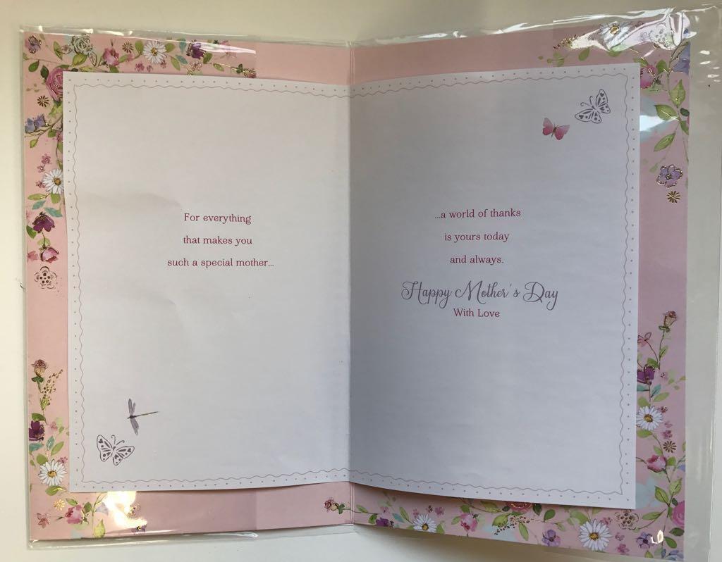 Share this special day with your wonderful Mum with this stunning Collection Mother's Day Card The birds flowers and butterflies are sprinkled with glitter for a little sparkle. Includes a pink envelope. Envelope Height (mm): 233 Envelope Width (mm): 153 Style: Sentiment Relationship: Mum Occasion: Mother's Day