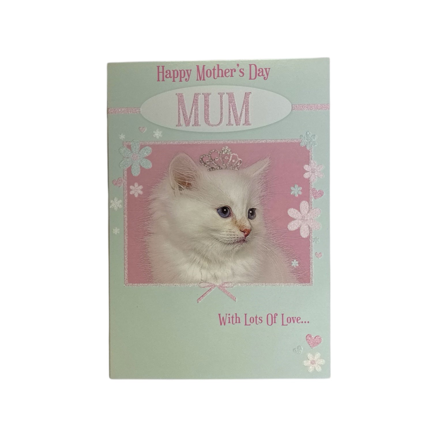 This Mother's Day card features a small, white kitten wearing a delicate tiara, set against a pastel mint-green background. The kitten's soft, fluffy fur and pensive expression add to the sweet and charming theme. Pink glitter flowers and small hearts decorate the background, enhancing the card's girlish and celebratory feel. The text, "Happy Mother's Day," "MUM," and "With Lots of Love..." is elegantly printed in a decorative font. The soft pastel colors and balanced composition create a warm and affectionate design, perfect for expressing love and appreciation on Mother's Day.