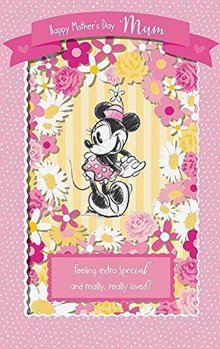 Mum Minnie Mouse Mother's Day Decoupage Window & Lazer Cut Flowers Card. Wording on Front: Happy Mother's Day MUM Feeling extra special and really, really loved? Inside Verse: Good! Because that's how you make me feel every day of the year! With Lots of Love on Mother's Day. Dimensions: 148 x 224mm. Finish: Matt, Decoupage Window & Lazer Cut Flowers