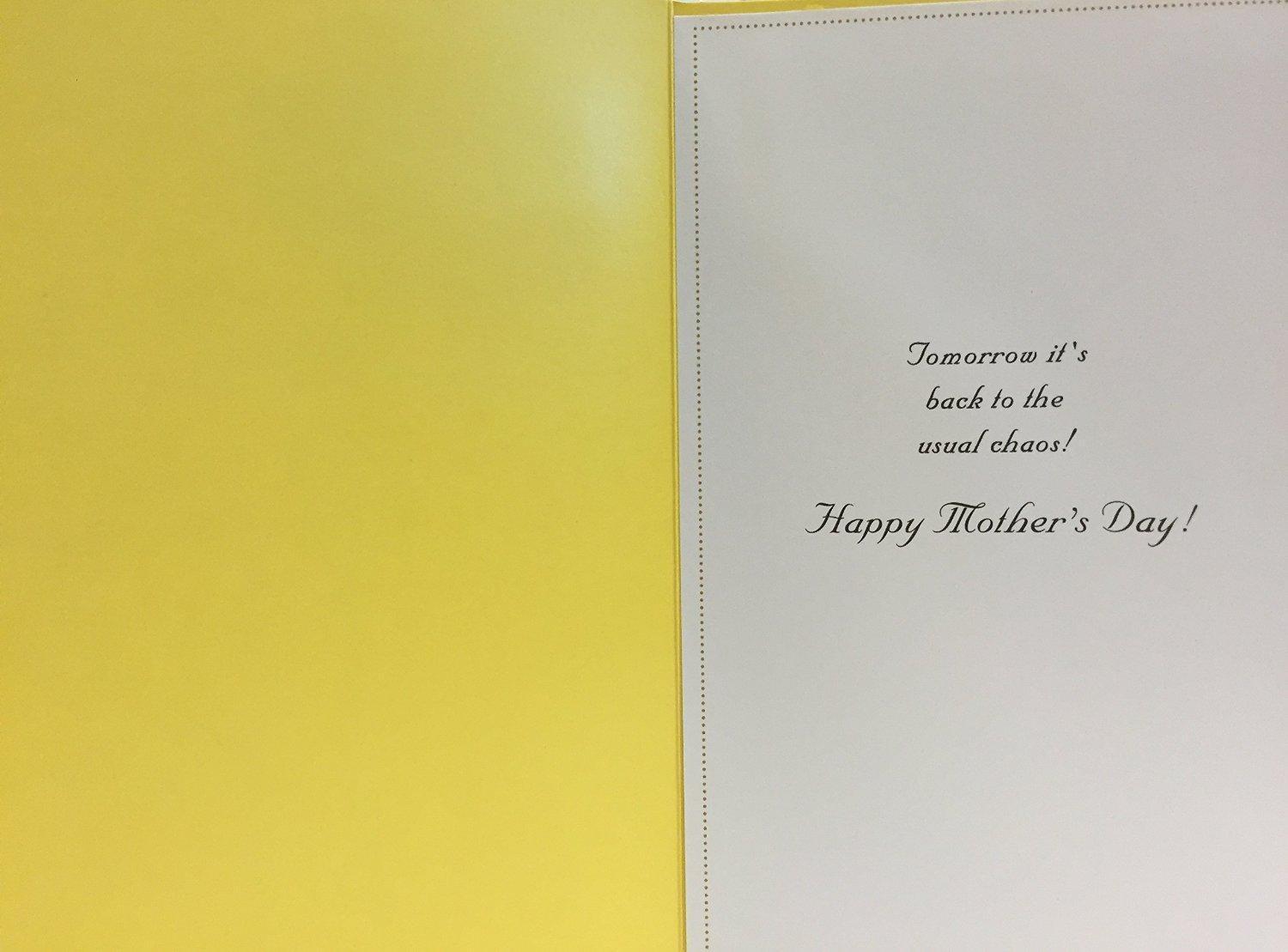Inscription: Tomorrow it's back to the usual chaos! Happy Mother's Day. Size: 4.75x7.25 Inches (approx). complete with envelope. Card has a raised panel on it's front and is highlighted with glitter