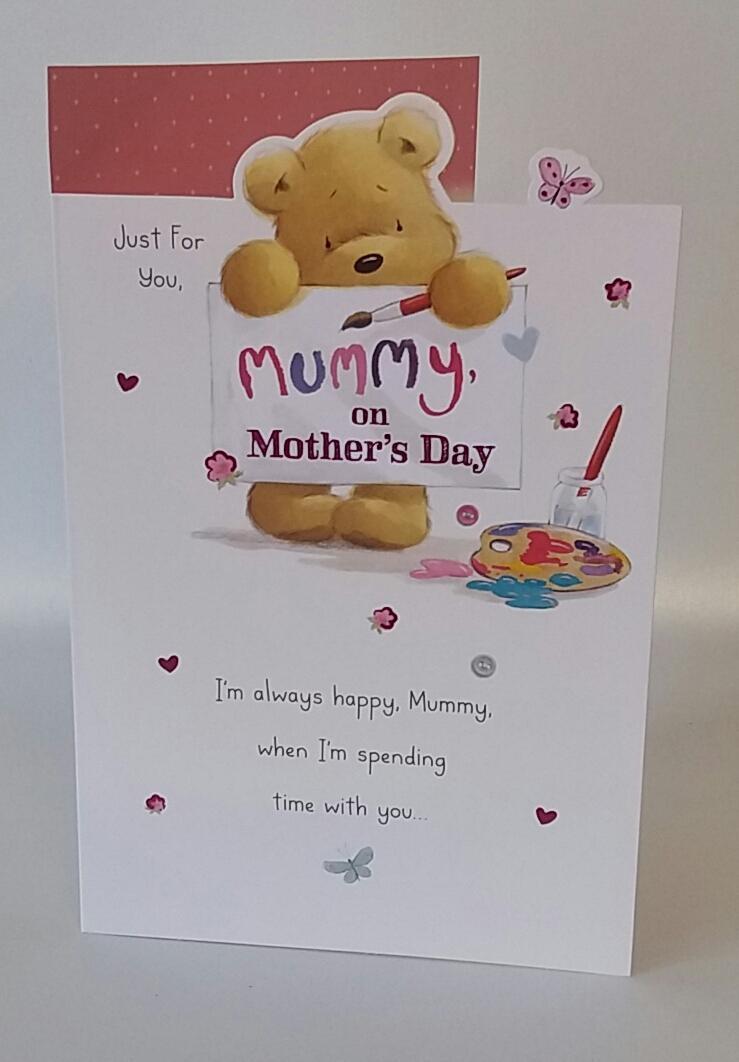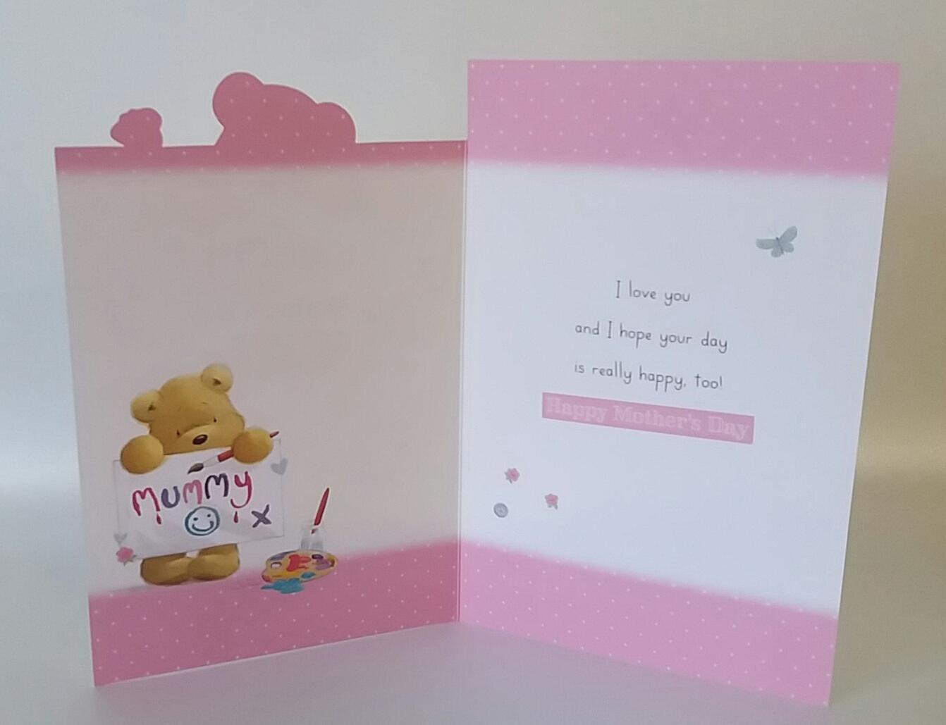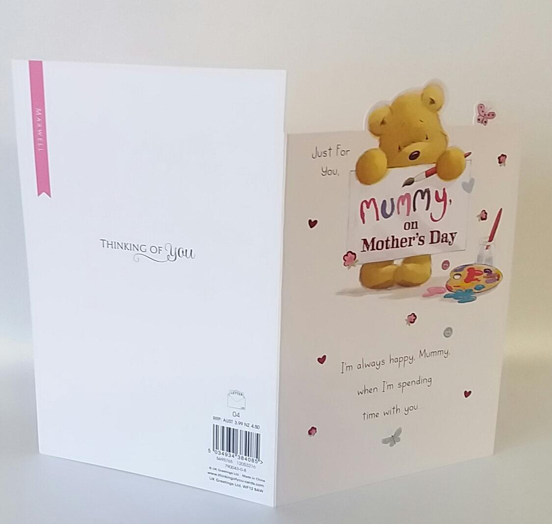 Wording on Front: Just for you, Mummy on Mother's Day. I'm always happy, Mummy, when I'm spending time with you... Inside Verse: I love you and I hope your day is really happy too! Happy Mother's Day. Finish: Matt, Foil, Die-Cut & Colour Inside. Dimensions: 210 x 135mm.