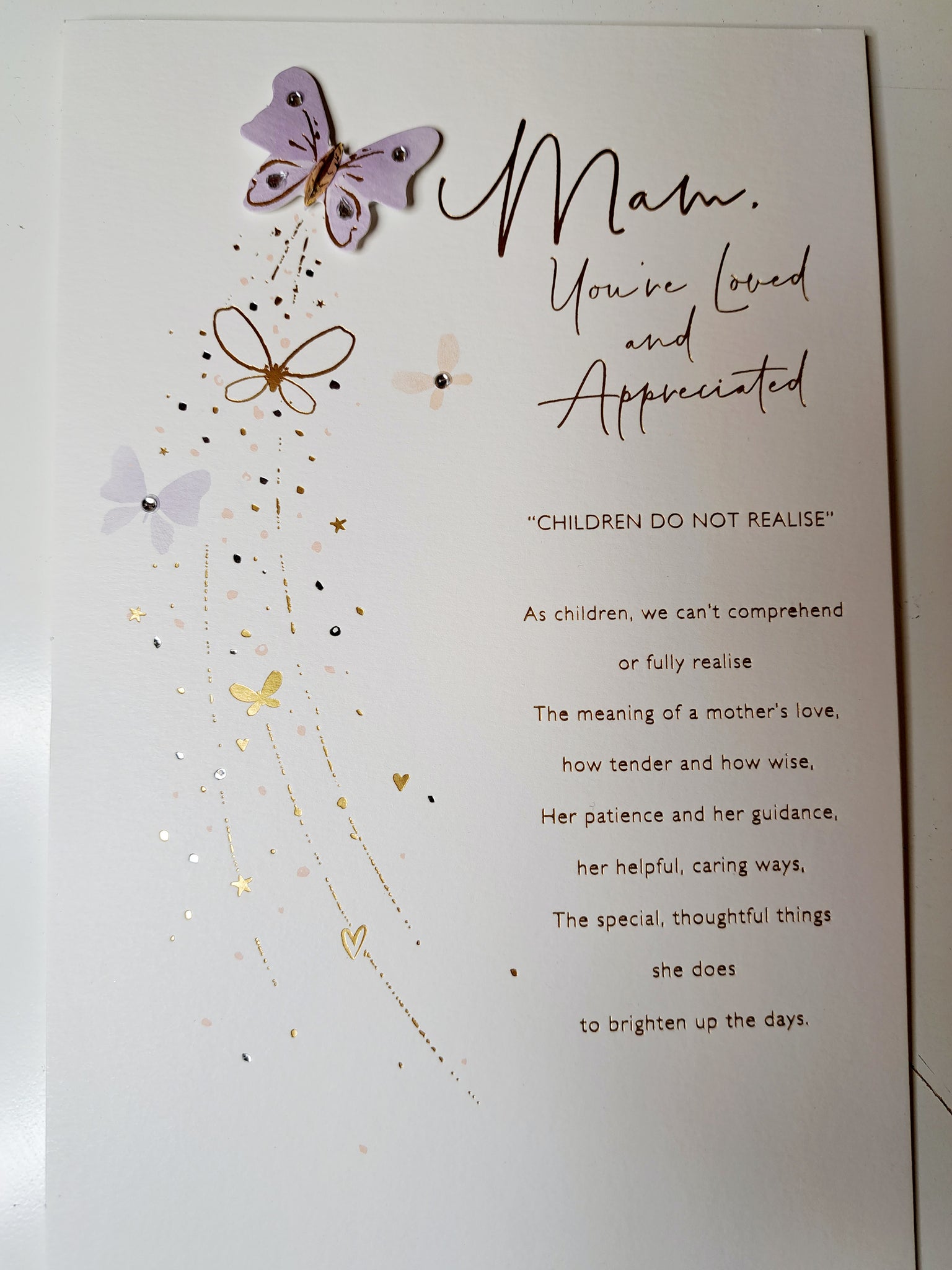 Tell a lovely mum how much you appreciate everything she’s done for you over the years with this sentimental Daydreams rhyming card. With a 3D butterfly, stunning foil accents and sparkling gems, it’s everything a wonderful mum deserves this Mother’s Day. Inside Message Reads: Years go by, before we know the depth of her concern, The love in her protectiveness - it takes so long to learn... Inside Message Continued: But as we grow, we understand, for we look back and see, Through older eyes and wiser hearts, her love and loyalty. It's these and many other things that make her grow more dear, More admired and more appreciated with every passing year. Inside Message Continued: You're a wonderful mam and you're loved more than you could know. Happy Mother's Day. Card Size: 165mm x 254mm. PLEASE NOTE CARD NOW READS AS MAM.