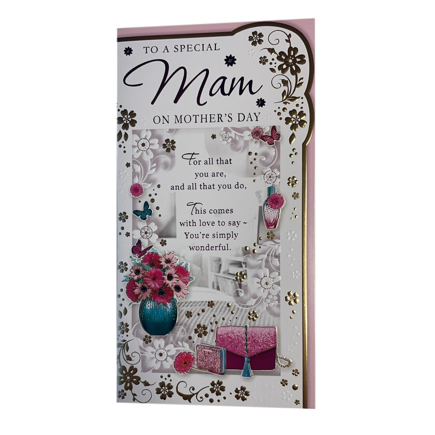 To A Special Mam On Mother's Day Purse And Flowers Design Card. Approx Size: 235 x 127mm.