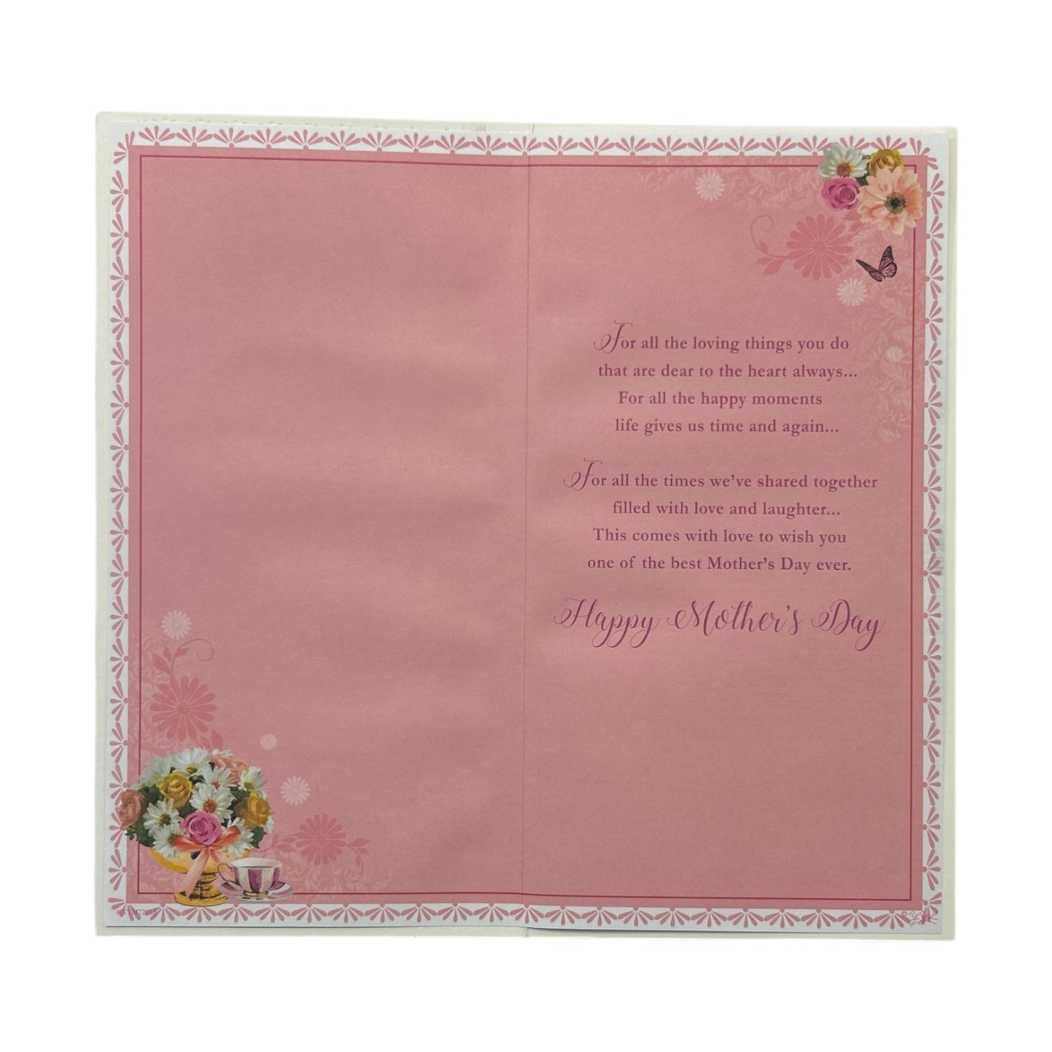 A Mother's Day greeting card features a decorative oval frame with floral designs and the text "Happy Mother's Day to a Dear Grandmother." The card's design includes a pink oval with a bouquet of flowers and butterflies. The inside of the oval contains a message wishing a happy Mother's Day. The card has a white background with an embossed floral pattern. The card comes with a coordinating envelope. Card size approx. : 27.5 x 18.5cm.