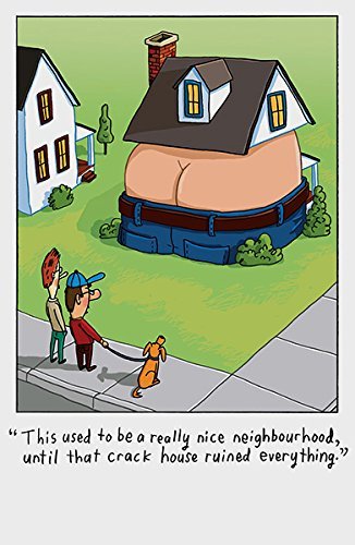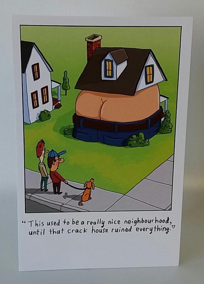 Wording on Front: "This used to be a really nice neighbourhood, until that crack house ruined everything." Inside Verse: Blank. Finish: Varnished. Dimensions: 177 x 126mm.