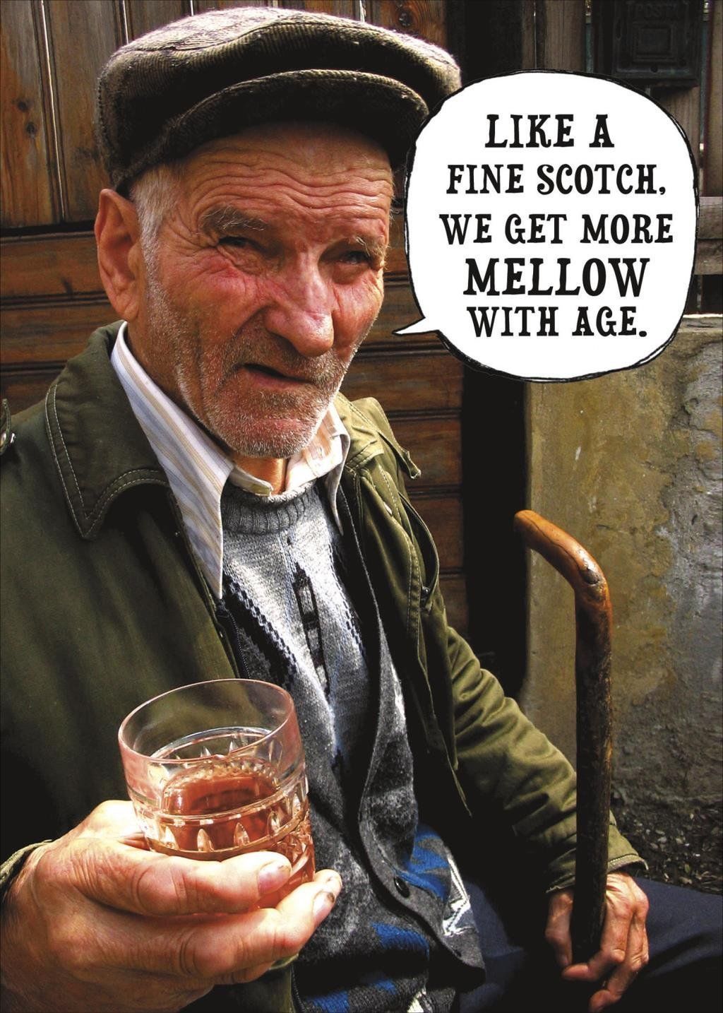 MELLOW WITH AGE! Humorous Bottlecap Greeting Card 127 x 178 mm Funny Card White Envelope. Inside Verse - VERSE: Or is it, as we age, we get more mellow with some fine scotch? Happy Birthday