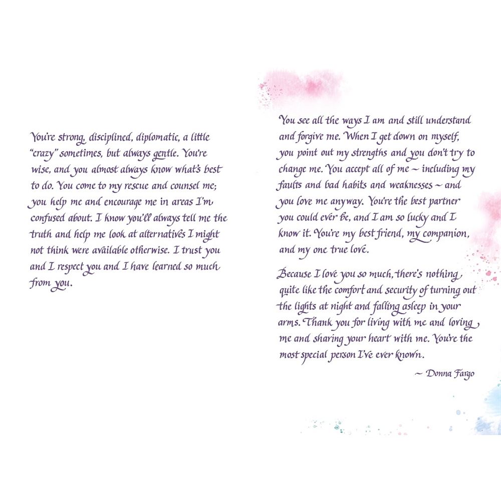 Meaningful words from the heart for the special person in your life. The beautiful design and uplifting message make this more than just a card… it’s a gift from the heart that your one true love will keep as a forever reminder of how much light and love they bring to your life every day. Master papermakers hand make the special paper used on the front of this card by adding colourful dyes to the pulp to create a beautiful swirl pattern; no two sheets are the same, making each greeting card a unique work of art. Two or three-panel card with interior message printed on a textured paper insert measures 5 x 7 in. And includes a quality off white envelope - Standard letter size.