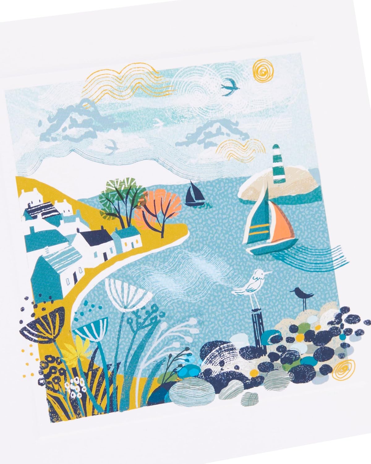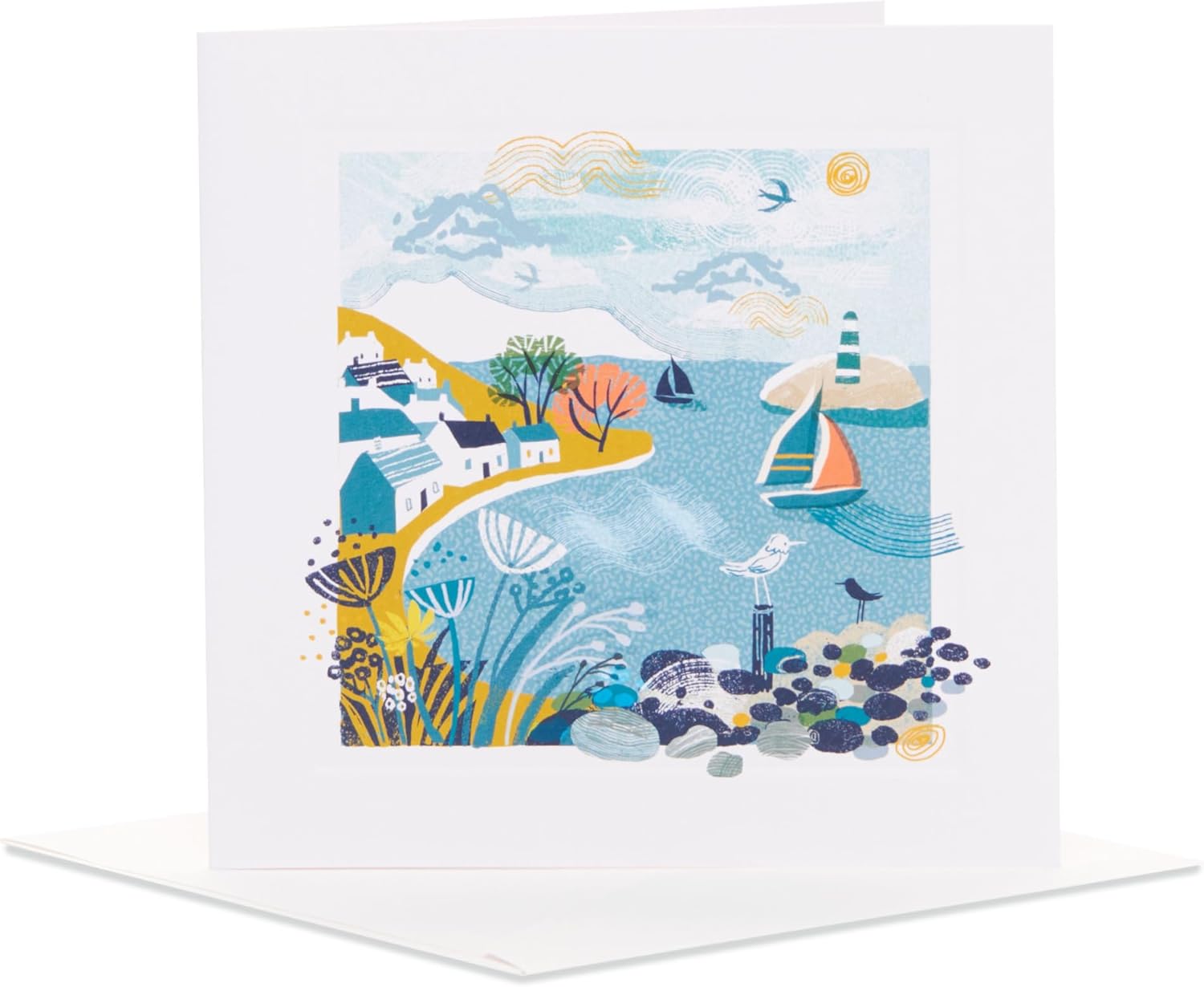 With an arty lino-print style seaside illustration and embossed details, this lovely card from The Camden Collection's The Wanderer range is printed on premium quality board and is blank inside for your own message. Blank Inside For Your Own Message Card Size: 15.9cm x 15.9cm | High Quality Envelope Included