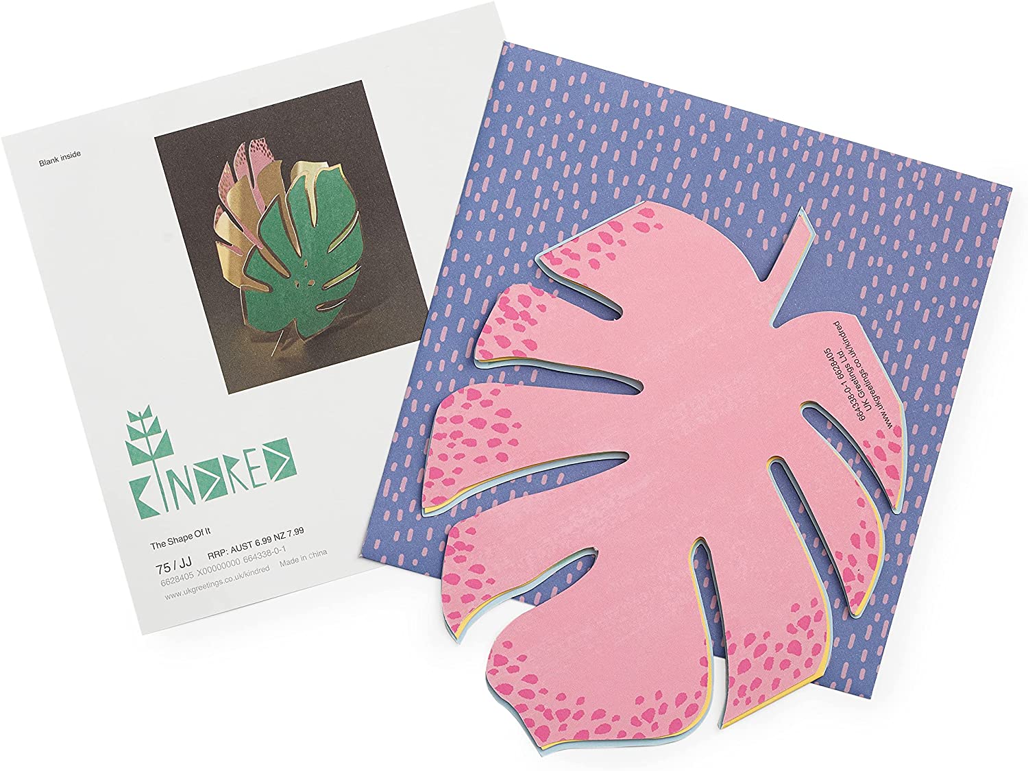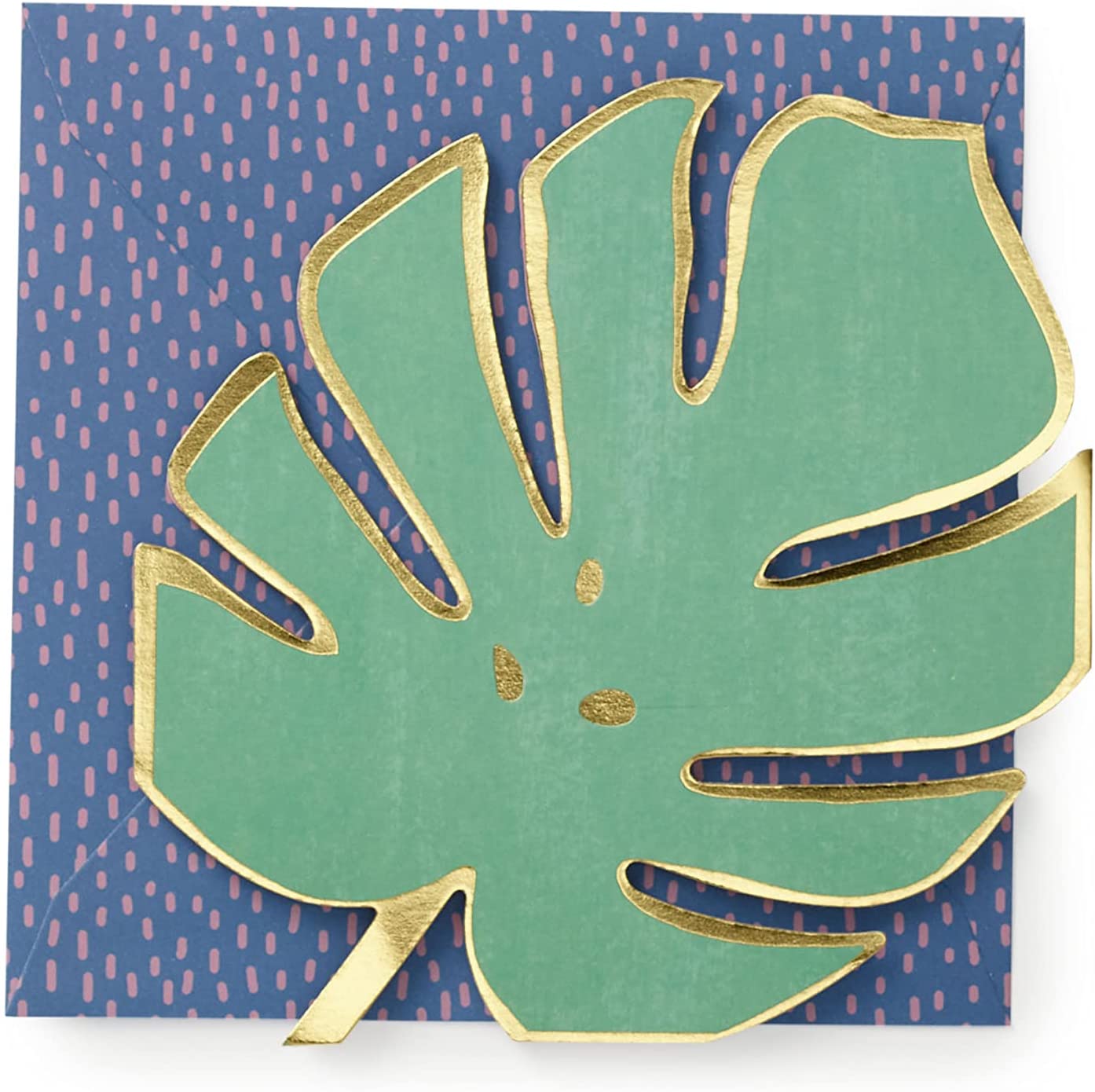 This stylish pop up card folds out 3 ways to reveal a trio of pink and green palm leaves with metallic gold trim. It's the perfect send for a variety of occasions. Blank inside for your own message. Card Size: 140mm x 140mm. 3D Pop-up Greetings Card. Envelope included.