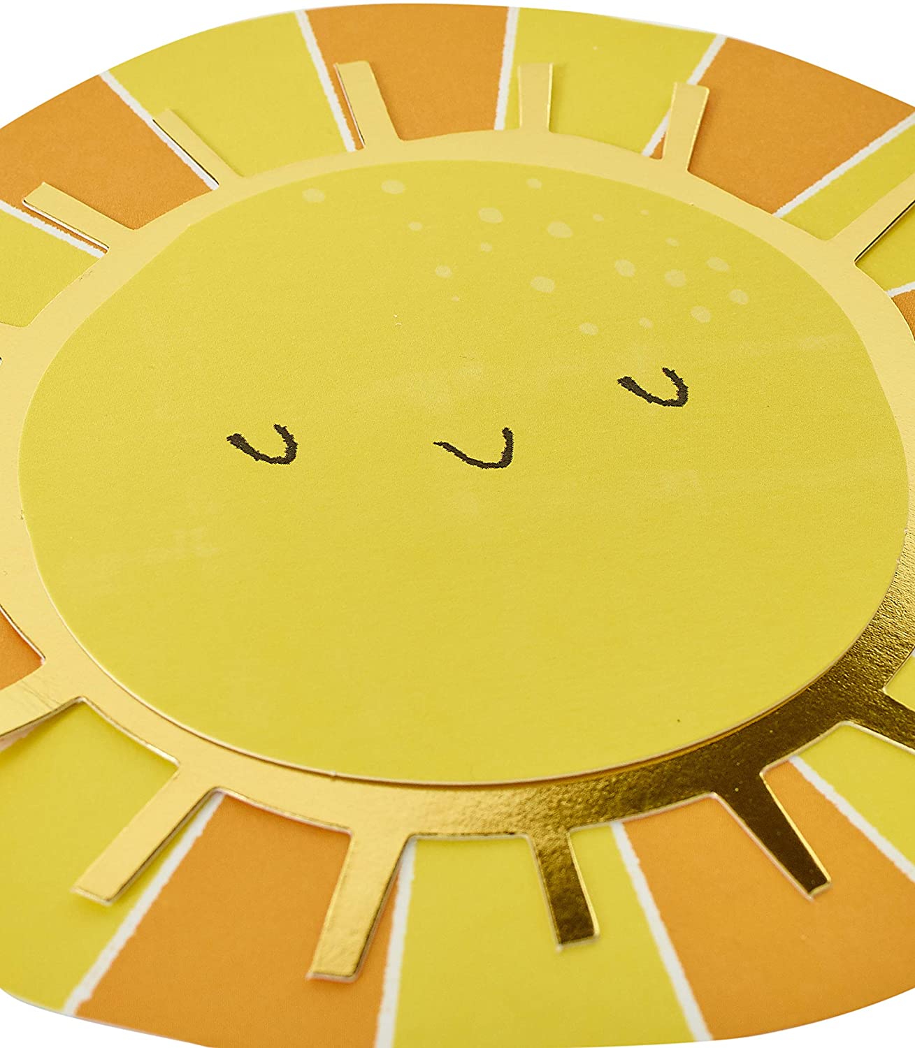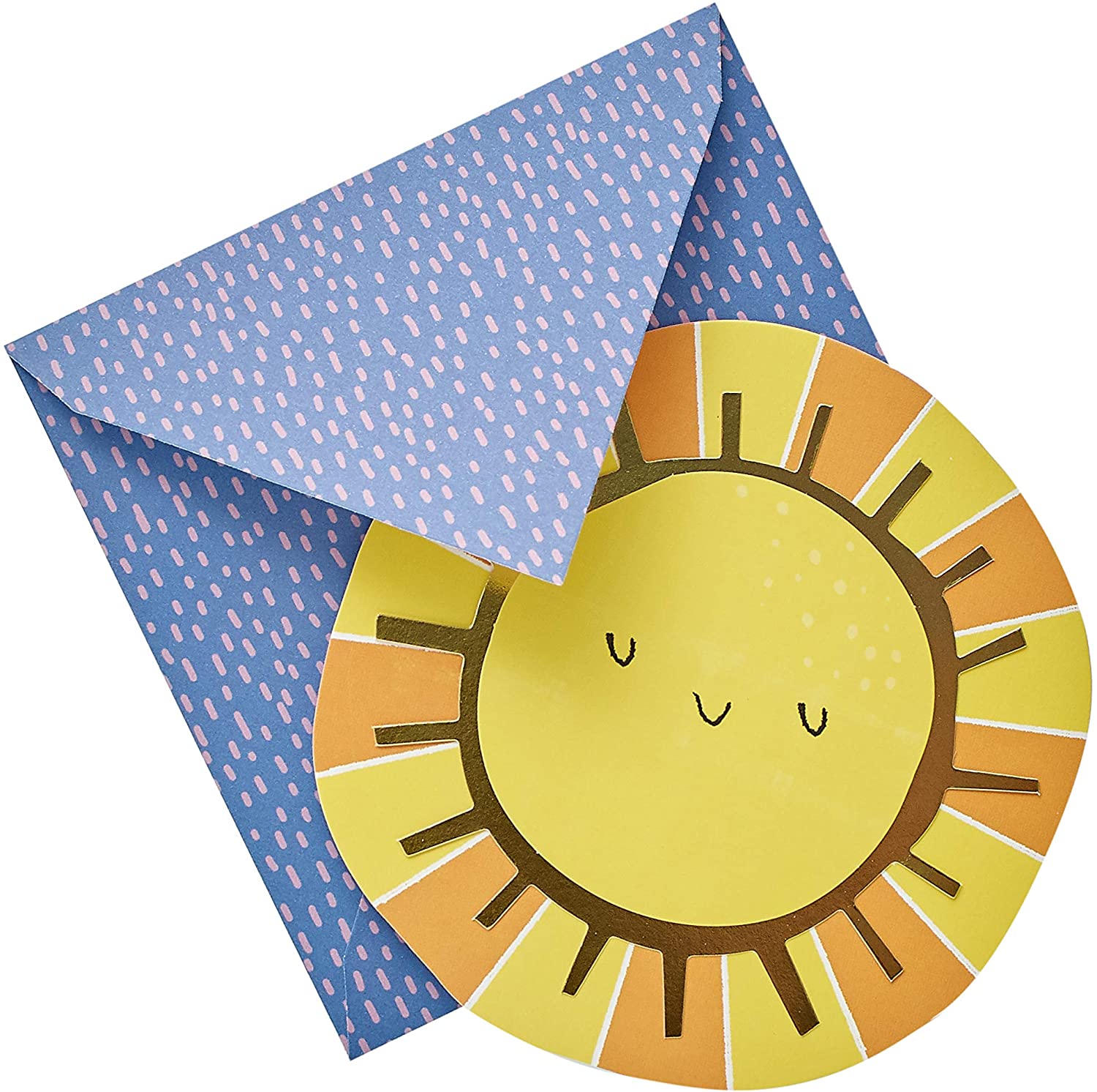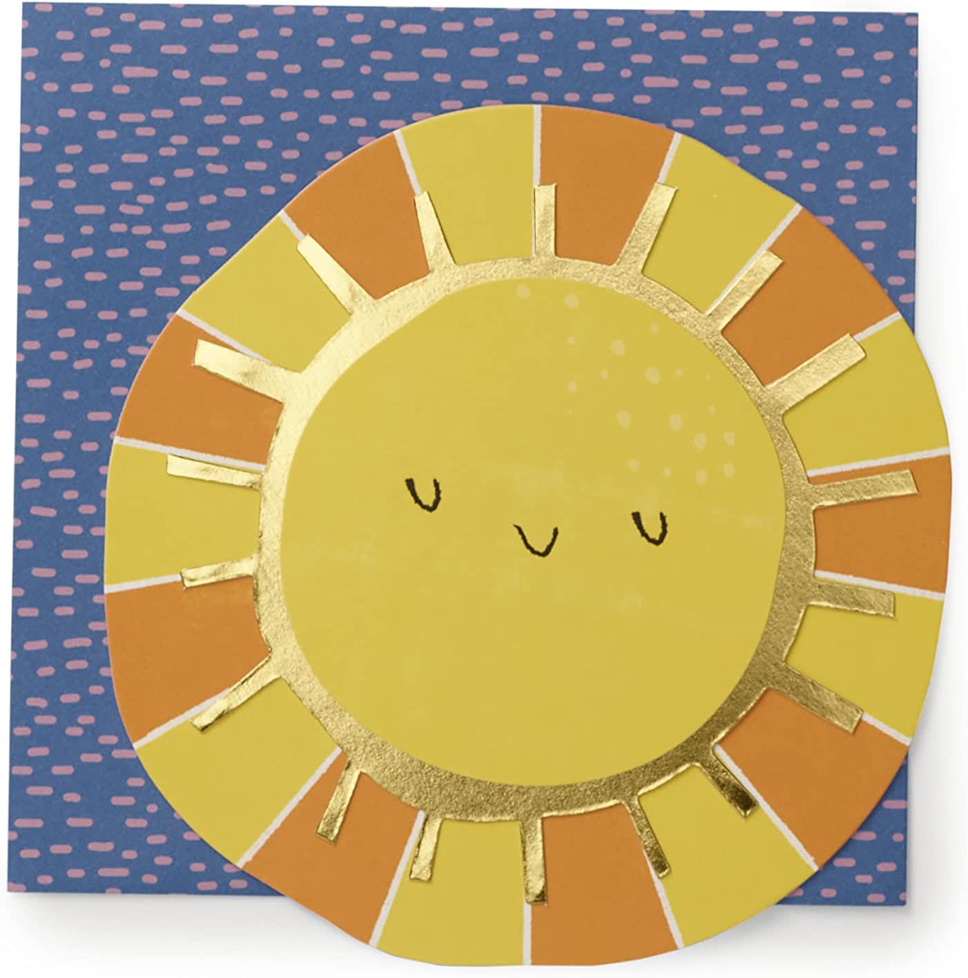 This bright yellow sun design with a cute smiling face has a pop out at the back which allows the card to be stood up. Blank inside for your own message. Card Size: 140mm x 140mm. 3D Pop-up Greetings Card. Envelope included.