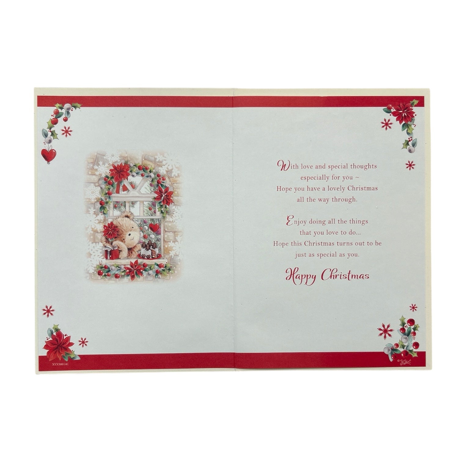 This festive Christmas card features a heartwarming teddy bear scene, perfect for sending love to that special someone. The design shows a teddy bear sitting in a beautifully decorated window, surrounded by poinsettias, holly berries, and snowflakes. A striking red glitter border frames the illustration, with the words “To The One I Love” elegantly written in gold lettering above, and “Happy Christmas” below. The overall design captures the warmth, love, and joy of the holiday season. Approx. size 225 x 155mm, supplied with a coordinating envelope.