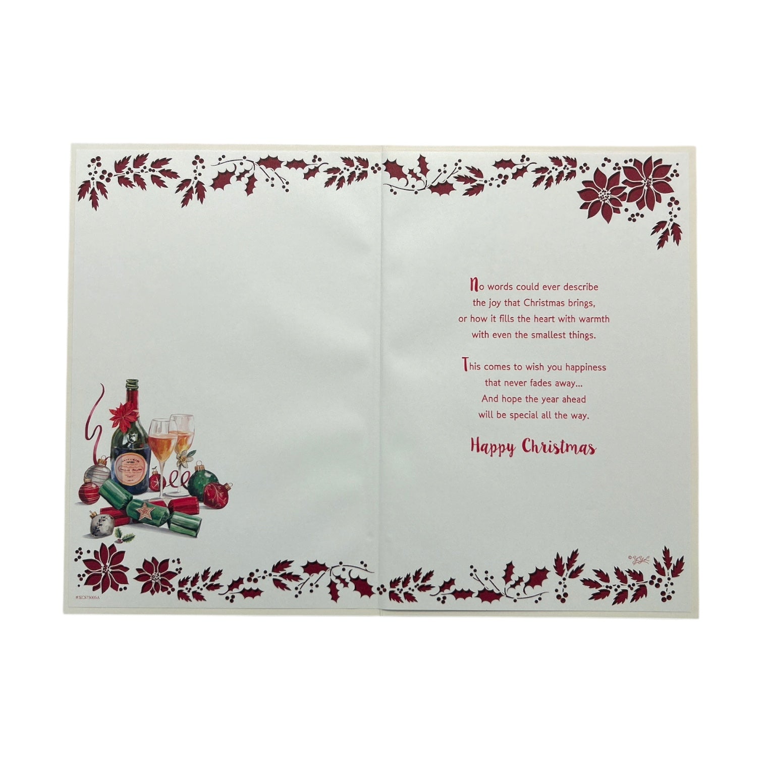 This exquisite gold foil-finished Christmas card is designed to convey your deepest affection to the one you love during the holiday season. Featuring a sophisticated design adorned with a champagne bottle and glasses, along with festive Christmas crackers, this card exudes elegance and celebration. The front of the card showcases the sparkling champagne bottle and glasses, surrounded by beautifully designed Christmas crackers, all embellished with shimmering gold foil accents. This elegant scene sets the stage for a heartfelt message that awaits inside, inviting your beloved to indulge in the joy and merriment of the season. Inside, there's ample space for you to write a kind and heartfelt message, expressing your love, appreciation, and best wishes to the one who holds your heart. Whether you're celebrating together or sending your love from afar, this card is a thoughtful way to let them know how much they mean to you during this special time of year. With its sophisticated design and heartfelt message, this card is sure to make your loved one feel cherished and adored. It's the perfect choice for sending a kind and thoughtful greeting that captures the spirit of Christmas and the depth of your love.