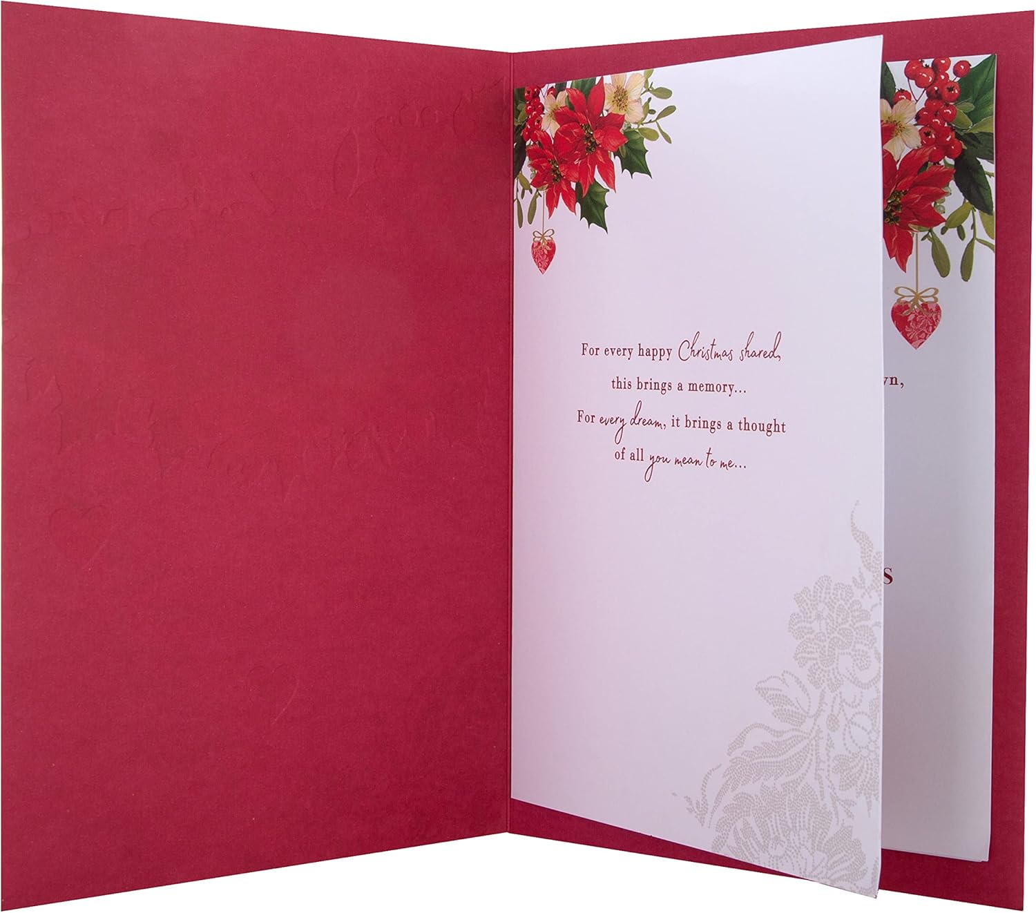 Take your love further this festive season and wish the one you love the most a beautiful Christmas message, filled with love, meaning and sentiment, with this stunning card, from Hallmark. Printed on high-quality 300gsm board, this card features a paper insert, gold foil details, embossed elements, a 3D attachment, a red raffia bow, and a gold paper heart gem, comes complete with co-ordinating dark red, floral designed presentation gift box, and a pair of red seals Cover Text on Card Reads: For the One I Love a Christmas message - Love adds more meaning to Christmas, just as you add more meaning to each day. Message Inside Card Reads: For every happy Christmas shared, this brings a memory... For every dream, it brings a thought of all you mean to me... For every special moment we've enjoyed right from the start... For every caring way you show what's always in your heart... For every good time that we've known, for the thoughtful things you do, for being everything to me, this brings my love to you. Wishing you a wonderful Christmas This card is fully recyclable, and made of material from well-managed, FSC-certified forests and other controlled sources. Comes complete with co-ordinating dark red, floral designed gift box Card Measures: 26 cm by 18 cm, Gift Box Measures: 26.8 cm by 18.5 cm by 2.2 cm; Suitable for hand-delivery