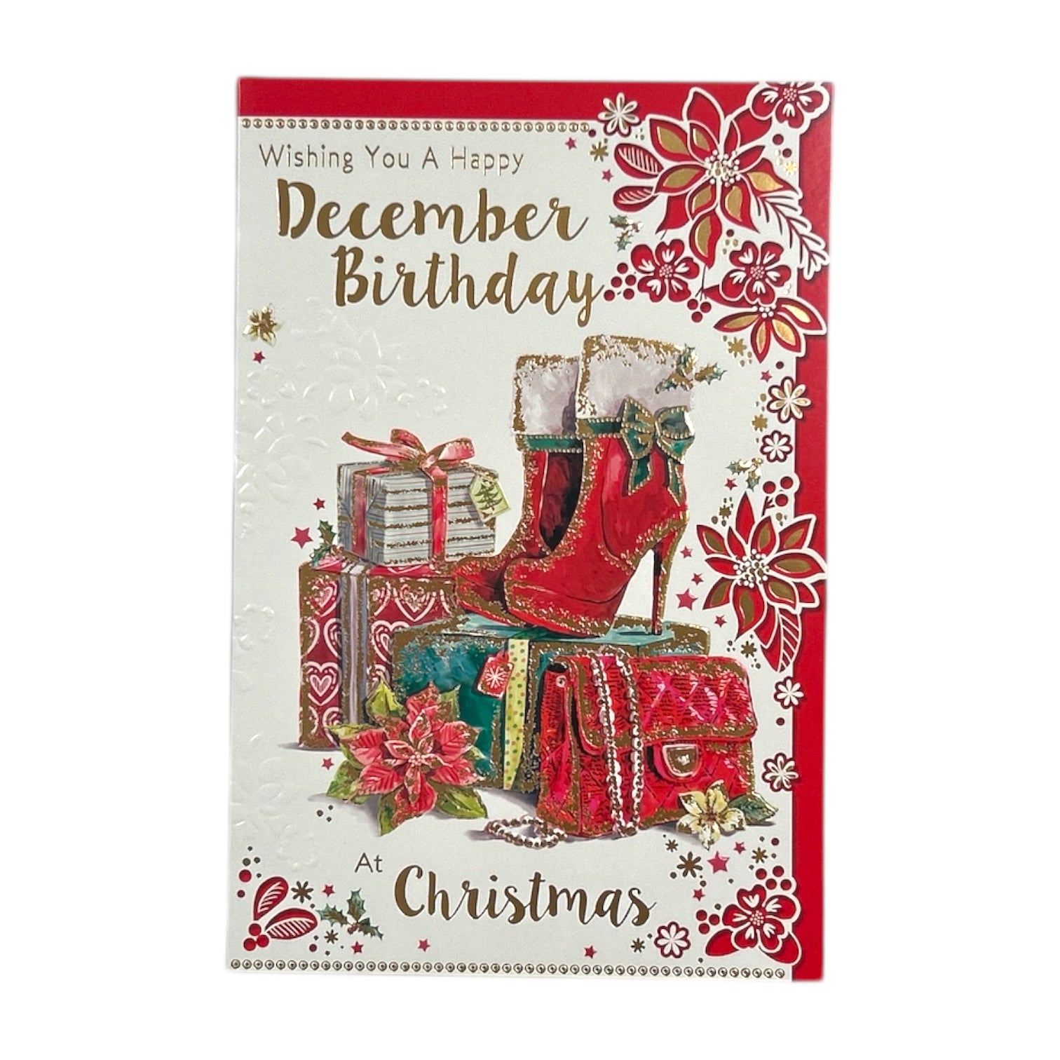 This stylish and festive card is the perfect way to celebrate a December birthday with Christmas flair. The design features a glamorous arrangement of glittering red high-heeled boots trimmed with white fur, a matching handbag, and beautifully wrapped presents. Surrounding the central image are vibrant poinsettias and holly leaves, adding seasonal richness and elegance. The red border and gold accents enhance the luxurious feel, making the card ideal for someone who loves fashion and festivities. The message “Wishing You A Happy December Birthday At Christmas” is warmly presented to blend birthday joy with holiday cheer. Perfect for catalog presentation or personal gifting, this card captures the sparkle of a double celebration. A standout choice for those born in the most magical month of the year. Approximate size: 225 x 155 mm.