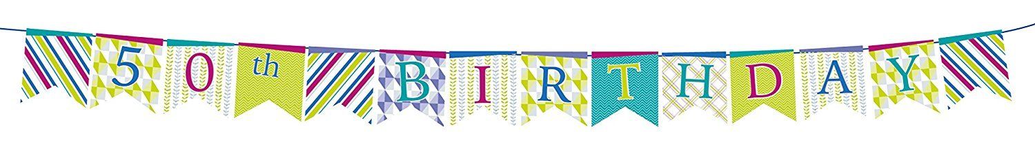 50th Birthday Bunting (generic) ideal to celebrate this very special occasion! 5 metre string 14 double-sided adjustable flags spot varnished Minimum length 2.1 metres Printed on paper board