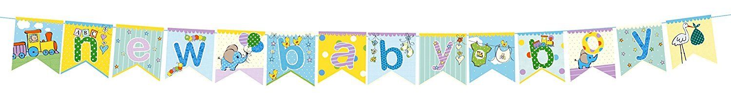 New Baby Boy Bunting, ideal to celebrate the arrival of a precious little bundle! 5 metre string 14 double-sided adjustable flags with sparkly glitter Minimum length 2.1 metres Printed on paper board