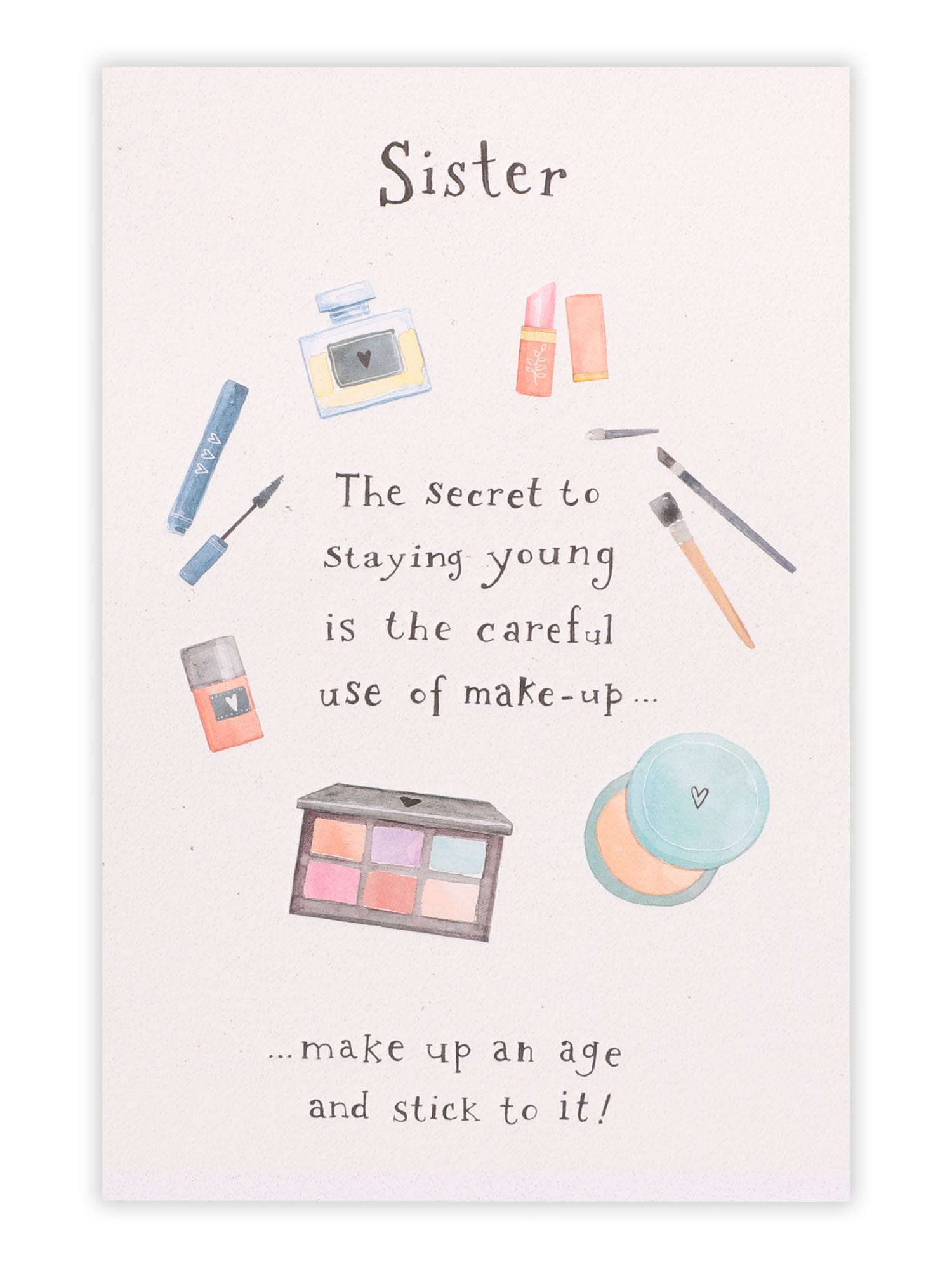 COVER MESSAGE: Sister The secret to staying young is the careful use of make-up... ...make up an age and stick to it! INSIDE MESSAGE: Happy Birthday! Size: 210mm x 137mm. PACKAGE SIZE: Standard Letter.