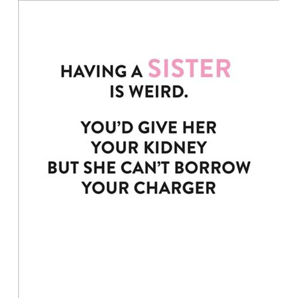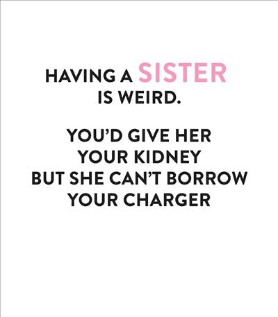 Celebrate the weird and funny truth about sisters and what you will and won’t give her with this deliberately low-key and stylish birthday card! Blank inside for your own message. Card Size: 159 x 184mm. Envelope Included.