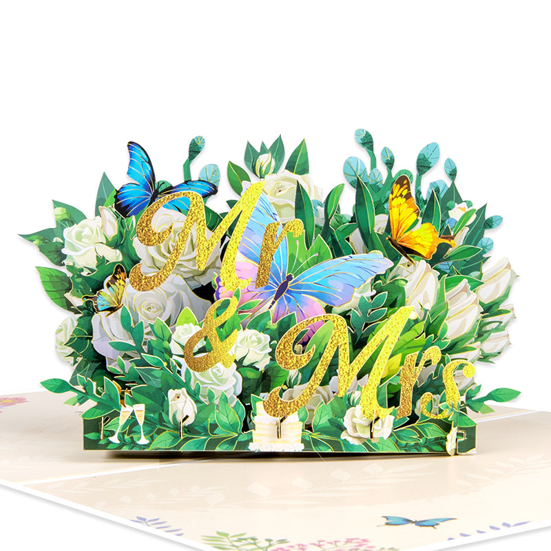 Celebrate a wedding in style with this beautifully crafted 3D pop-up greeting card. Opening the card reveals a vibrant scene of lush green foliage, colorful butterflies, and elegant golden cursive text reading “Mr & Mrs.” The intricate paper engineering and detailed floral accents make this card a keepsake that feels more like a gift than just a greeting. Measuring 15 x 20 cm, it includes a blank insert (8.5 x 13 cm) for your personal message, perfect for weddings, anniversaries, or bridal celebrations. The matching cover features a floral wreath with the same “Mr & Mrs” text, ensuring the card looks stunning inside and out. With its romantic theme and artistic design, this card is a thoughtful way to honor love and commitment.