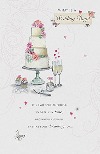 "What is A wedding day?..." Beautiful wedding card with loving message Inside Message Reads: it's the saying of vows, the rings and the Kiss Ð it's the bride and groom, with hearts filled with Bliss Envelope Included. Dimensions: 227 x 149mm