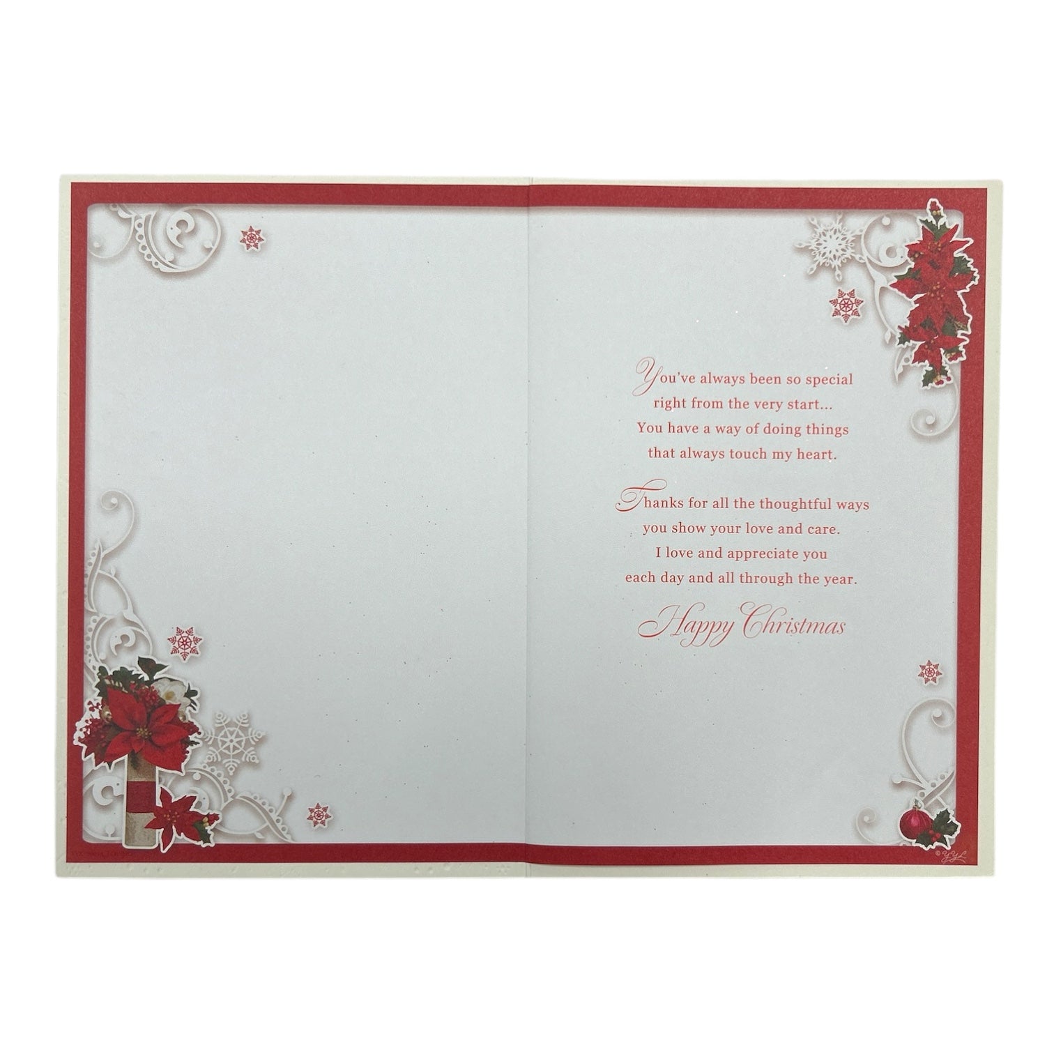 Celebrate the love you share with this beautifully crafted Christmas card for your wife. Featuring rich red poinsettias, golden gifts, and delicate snowflakes, the design is framed by ornate embossed swirls and shimmering stars that evoke the magic of the season. The heartfelt message “Christmas is special… a time to show how much we love and how much we truly care” sets a romantic tone, perfect for expressing deep affection. Glitter accents add festive sparkle, while the warm palette creates a cozy, elegant feel. Thoughtfully designed to honor your bond, this card is a keepsake she’ll treasure. A perfect way to make her feel cherished this holiday. Approx. size: 225 x 155 mm.