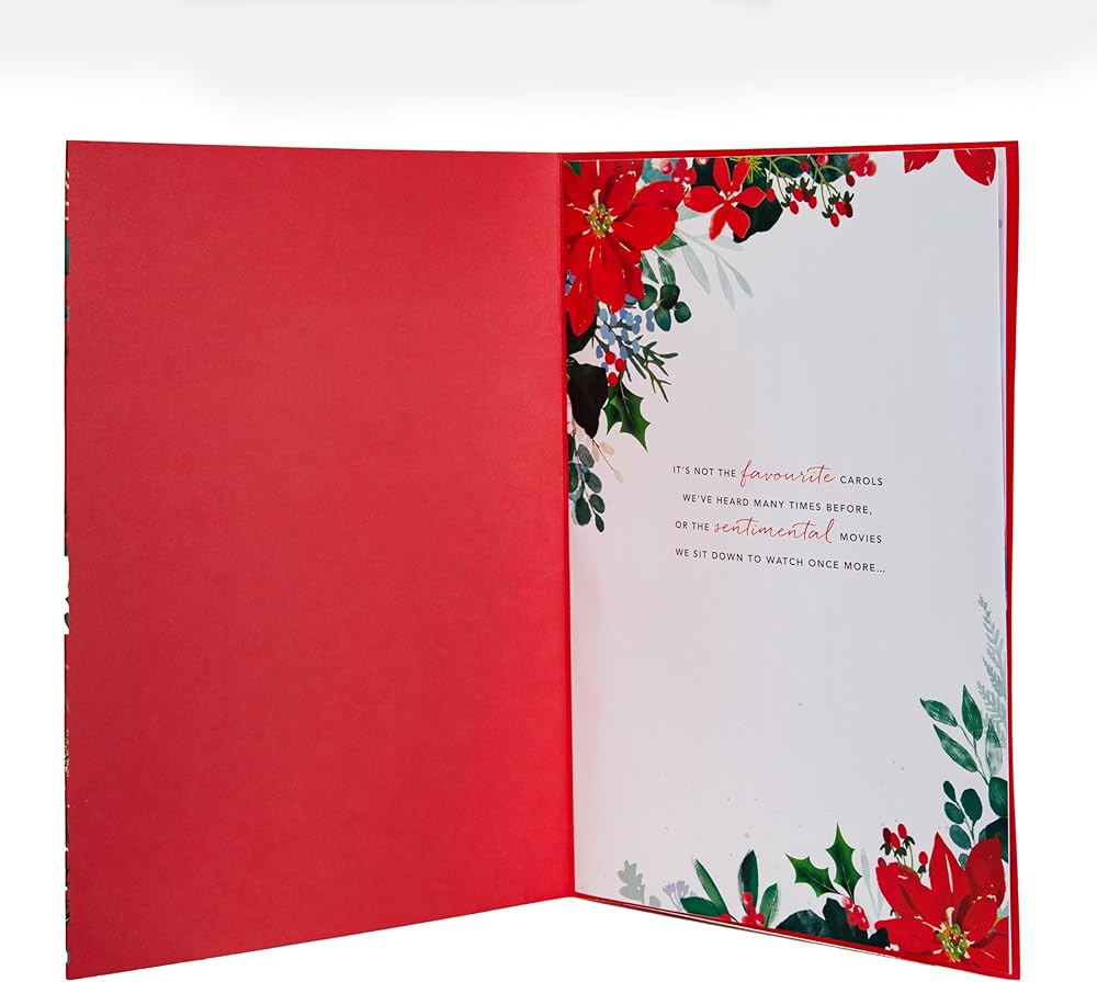 Let your amazing wife know that she's at the very heart of all your Christmas celebrations, with this gorgeous festive foliage themed Luxury Boxed Christmas Card from Hallmark .This card features a die-cut design, a 4-page paper insert, heartfelt seasonal message, embossed elements, gold foil details, and gold-foiled paper 'gem' stars. Message Inside Reads: It’s not the favourite carols we’ve heard many times before, or the sentimental movies we sit down to watch once more...It’s not surprises that we plan or presents that we buy, it’s not the frosty weather or the snowflakes in the sky...It’s just spending time together, no matter what we do, since what makes Christmas special is sharing it with you. All my love. H30.5cm by W21.9cm, Within UK 'Large Letter' Postage Size Limits, and Comes Complete with Co-ordinating Red Presentation Box