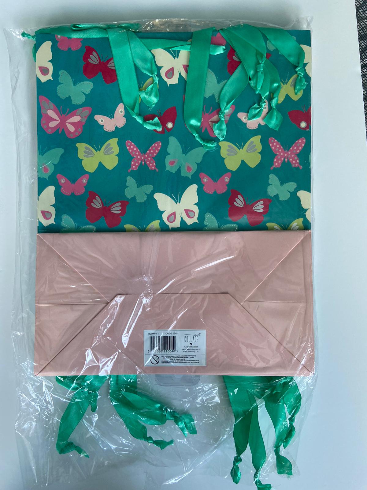This large birthday gift bag featuring a contemporary Butterfly design and is perfect for Wishing any friend A lovely Day The perfect size gift bag for Large gifts including clothes, toys and other larger gifts This fun Butterfly design gift bag features turquoise Striped ribbon handles and matching gift tag This stunning gift bag is perfect to send for birthdays Or Occasions Size dimensions: W: 267mm x H : 330mm x G: 137mm - Bag quantity x 6